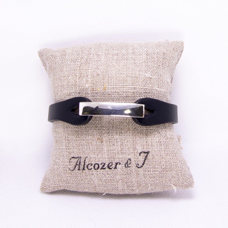 Bracciale uomo in cuoio nero chiusura piastra liscia in ottone galvanizzato argento.