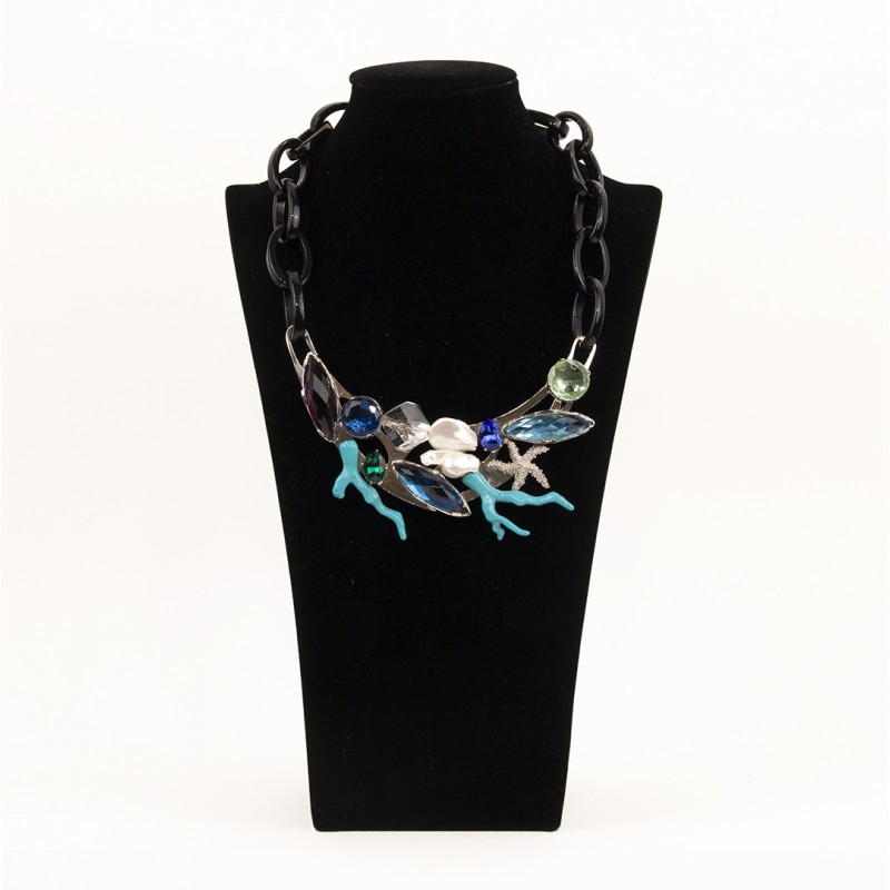 Collana corta con piastra centrale in ottone galvanizzata argento con cristalli e rami di resina - catena resina - chiusura ad anello.