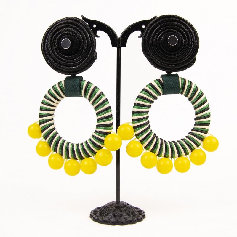 Orecchini a clip con cerchio rivestito in filo verde e sfere gialle.