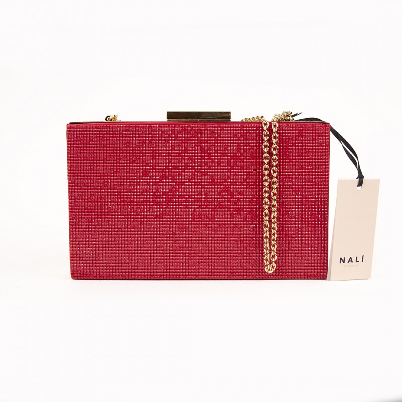Clutch in micropietre rosso ciliegia, chiusura a scatto, tracolla oro e finiture oro.