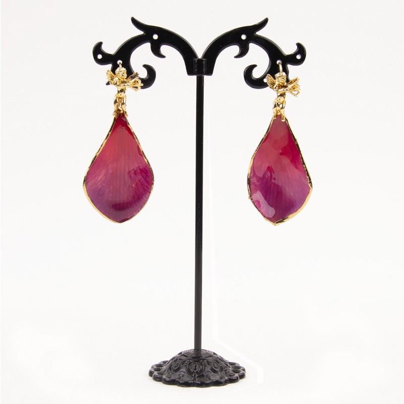 Orecchini con petali di rosa veri cristallizzati colore magenta bordati in oro, amo con angioletto in argento 925 bagno oro 18kt.